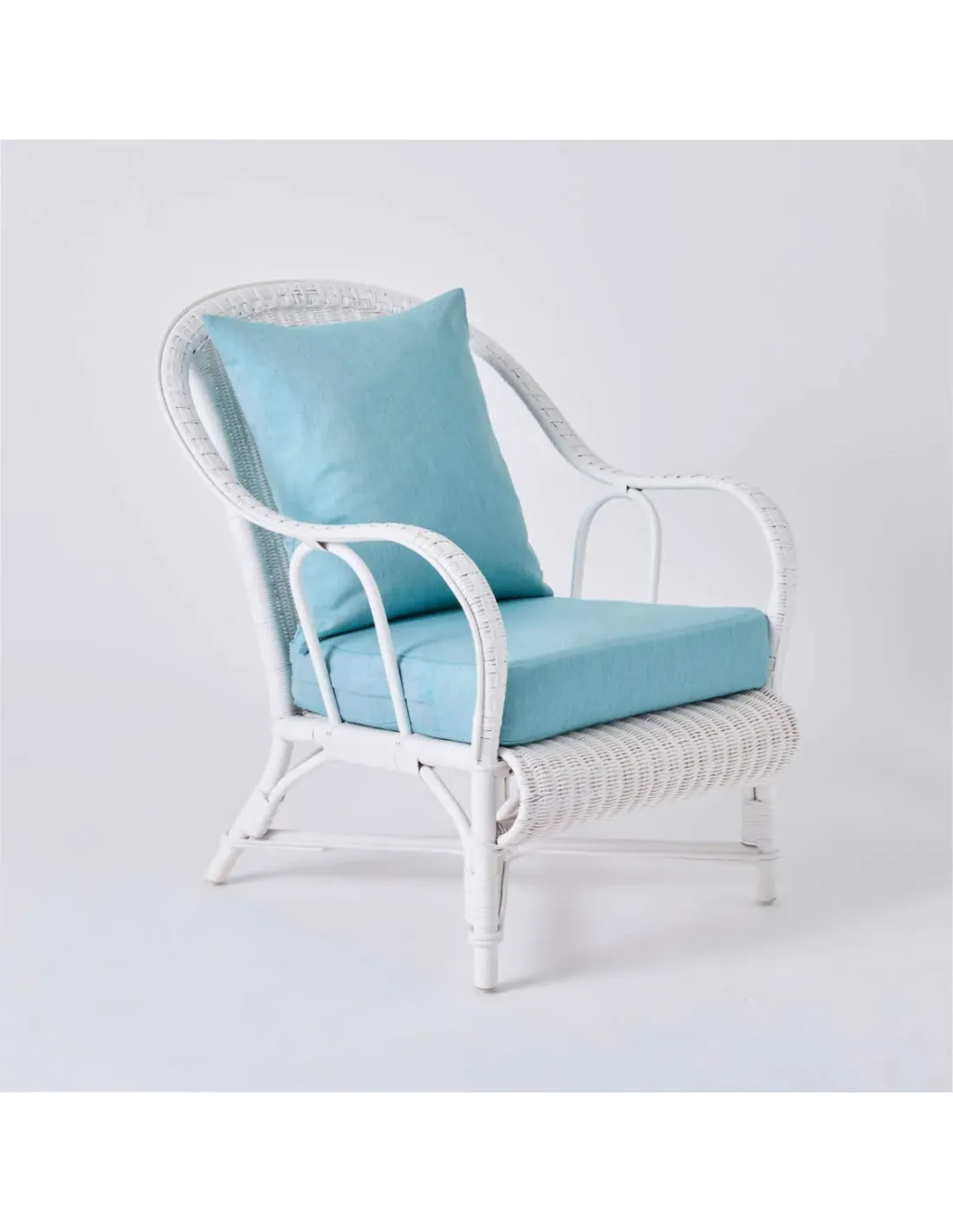 Structure en rotin naturel finition "laqué blanc". Mousse polyuréthane de densité 30 kg/m3 pour le coussin d'assise, et ouate de polyéther dans le coussin de dossier. Coussins déhoussables.