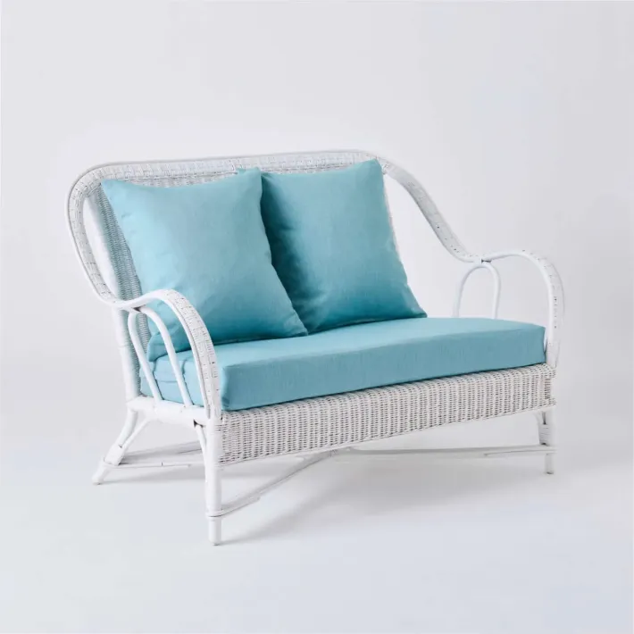 Le canapé Primavera en rotin tressé laqué blanc convient à un usage privé et professionnel dans les hôtels.