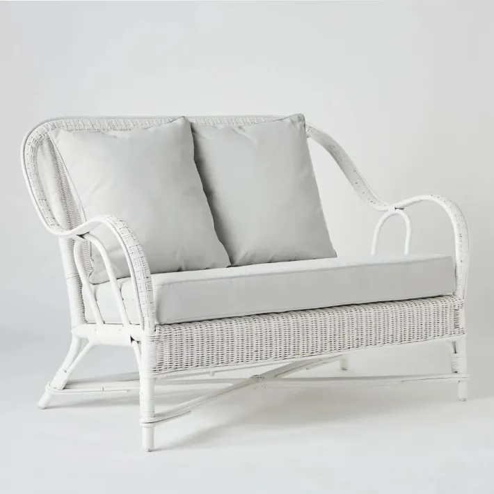 Le canapé Primavera en rotin tressé laqué blanc convient à un usage privé et professionnel dans les hôtels.