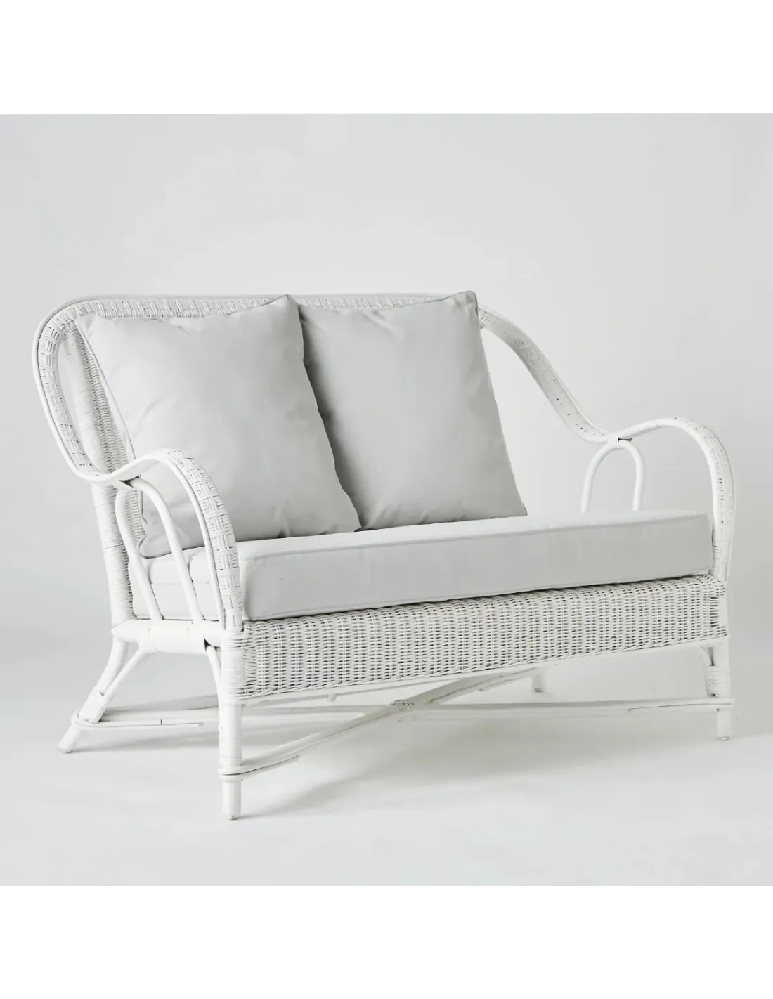 Dimensions hors tout : haut 83 x larg 121 x prof 78 cm, assise à 44 cm de hauteur (avec coussin). Largeur d'assise 102 cm (avec coussin), profondeur d'assise 52 cm (avec coussin). Poids 17 kg. Structure en rotin naturel finition "laqué blanc". Tressage en moelle de rotin finition "laqué blanc". Mousse en polyuréthane de densité 30 kg/m3 pour le coussin d'assise, et ouate de polyéther pour les coussins de dossier. Coussins déhoussables. Tissu chiné gris 100% oléfine traité anti-UV et anti moisissures. Tissu client disponible pour cet article. Nous contacter pour les modalités. Fabriqué en Indonésie.