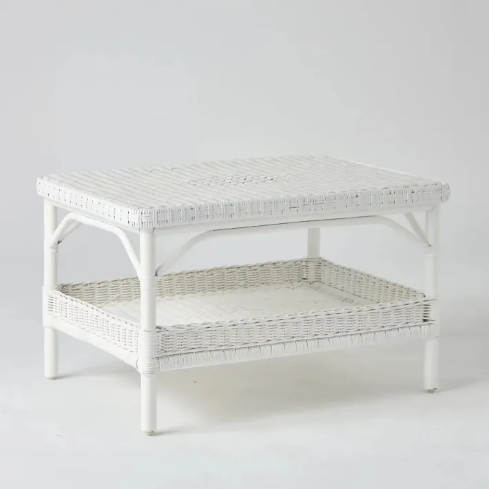 La table basse rectangulaire en rotin laqué blanc Primavera convient à un usage privé et professionnel en milieu hôtelier.