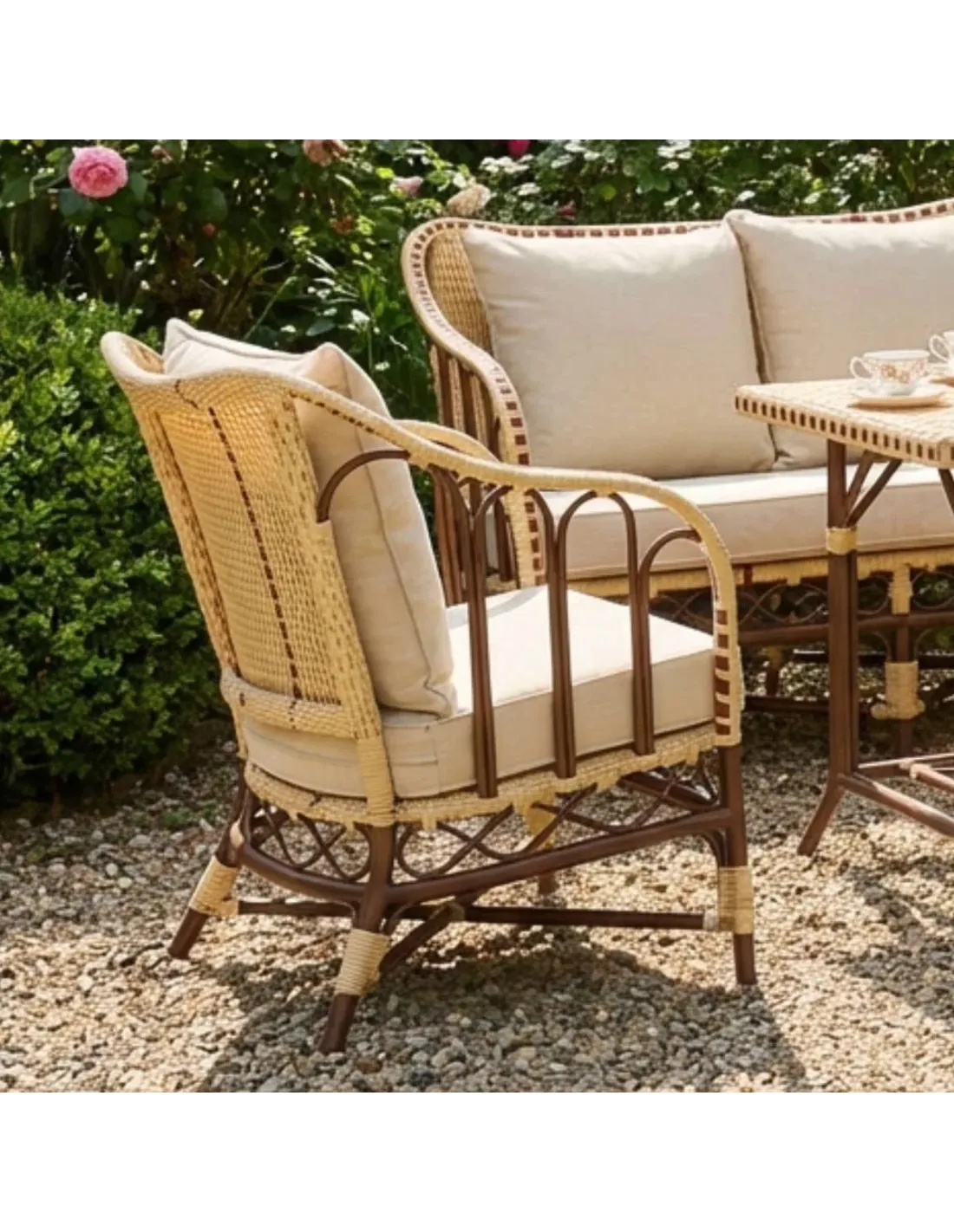 Le fauteuil en résine tressée Belle Epoque est la version destinée aux jardins du fauteuil en rotin Bagatelle. Dimensions plus généreuses, plus bas d'assise et équipé d'un confortable coussin en deux parties (assise et dossier), il reprend la ligne graphique très "Belle Epoque" de notre collection Bagatelle avec une résine tressée qui imite à la perfection le tressage du rotin, des arcades d'accoudoirs et de dossiers en arabesques, un tressage bicolore et une structure en aluminium laqué de couleur brun foncé. Un superbe travail entièrement fait main qui s'intègrera harmonieusement à votre extérieur, votre jardin ou même votre véranda.