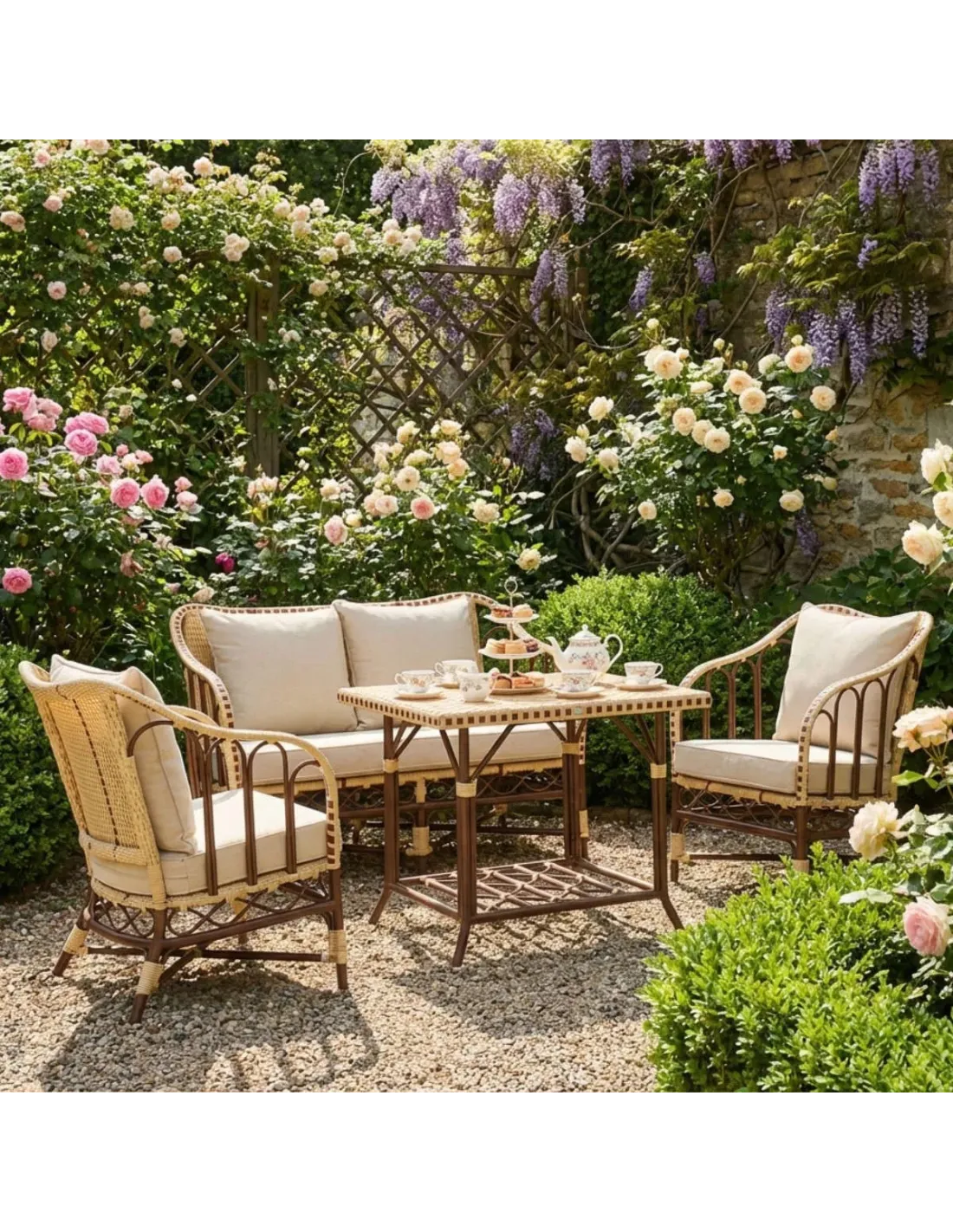 Au tournant du siècle dernier, le rotin connût un âge d'or, tant il se prêtait par sa facilité de mise en œuvre aux volutes, arabesques et enchevêtrements qui furent la marque du style Art Nouveau. Le charme des après-midi sous la tonnelle, des promenades au jardin botanique, et des cafés sur les grands boulevards, fait désormais partie de notre art de vivre à la française. KOK MAISON, avec sa ligne Belle Epoque, réédite aujourd'hui des meubles version outdoor qui imite à la perfection le charme du rotin. Chaque modèle de cette collection a son dessin, sa ligne bien à lui, comme s'il avait été chiné individuellement, mais se coordonne aux autres par le choix d'une finition commune. Le fauteuil en résine tressée Belle Epoque avec coussins se coordonne avec un canapé assorti.