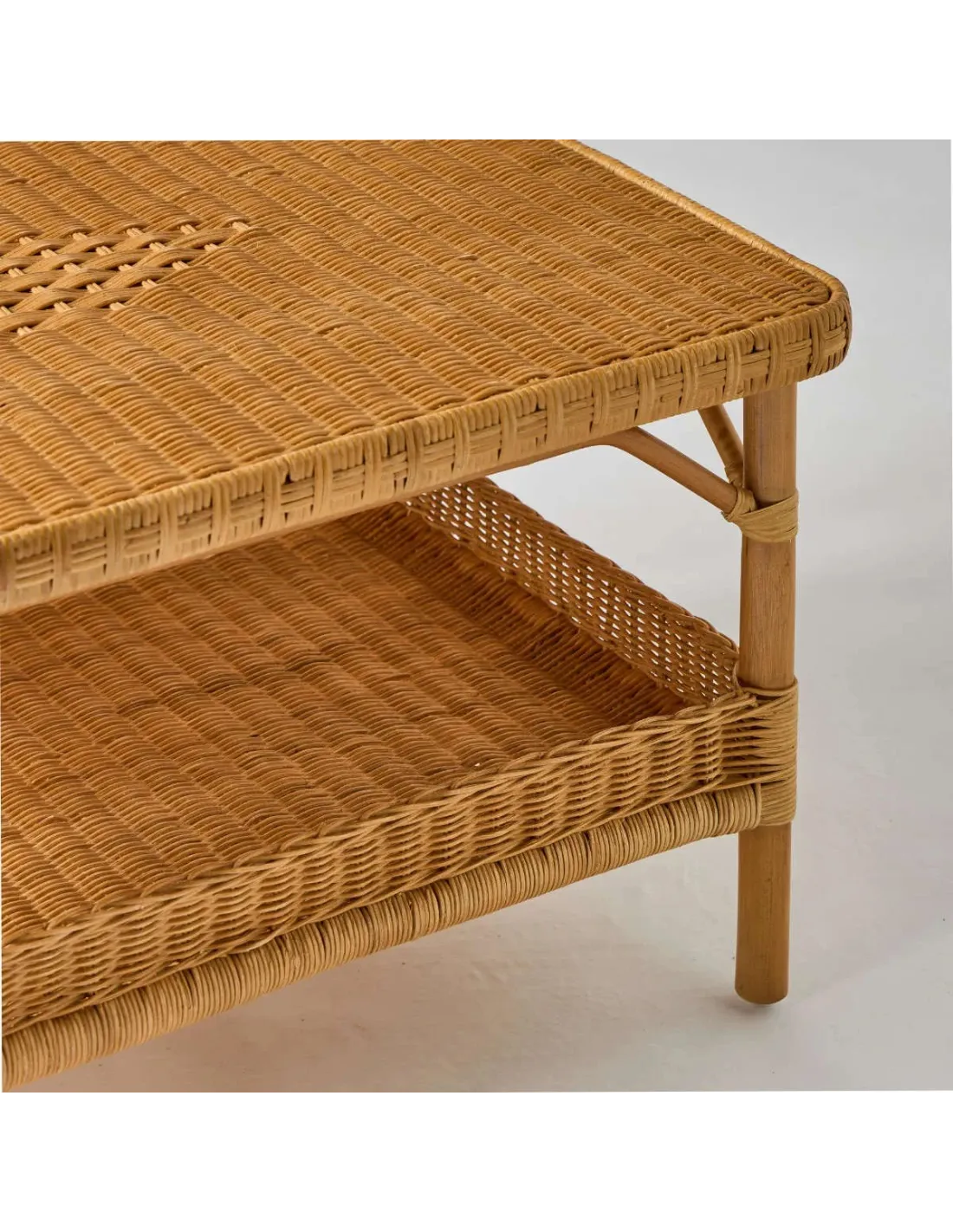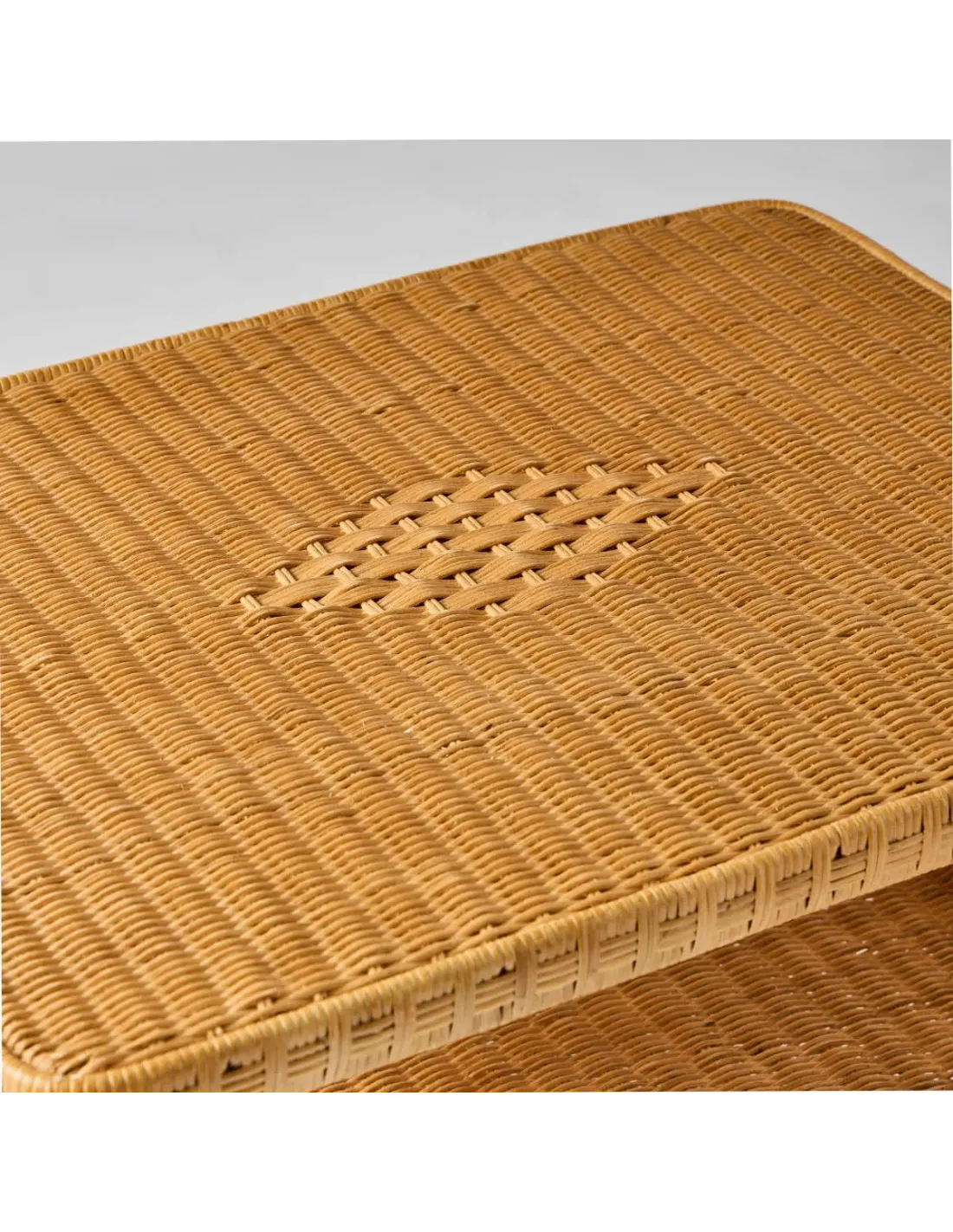 La table basse rectangulaire rotin miel Nantucket peut être équipée en option d'un plateau en verre de protection et se décline en version naturelle ou patinée.