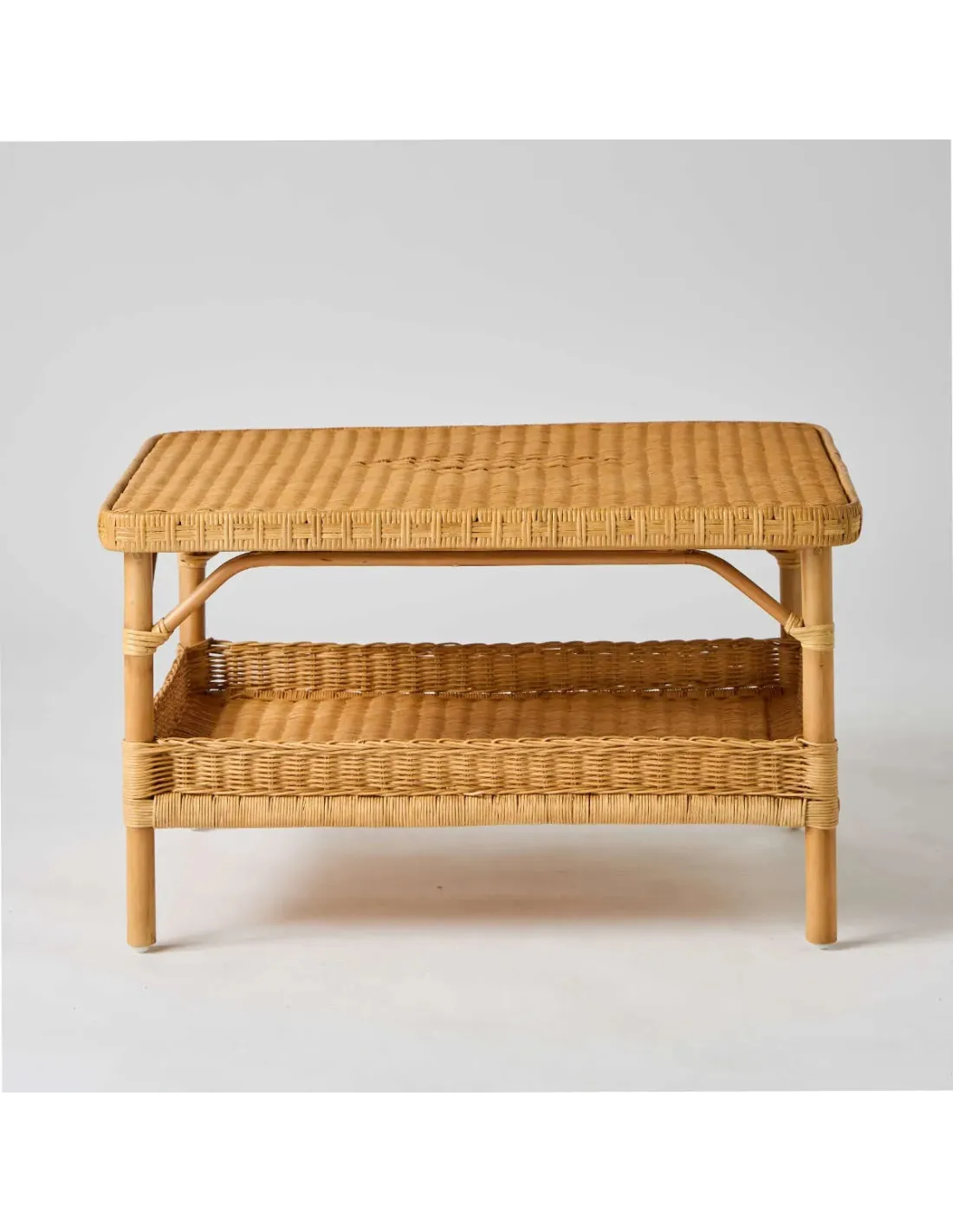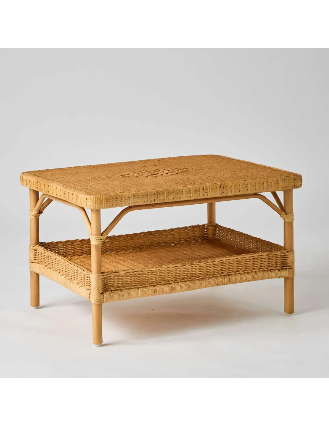 Assortie à la ligne des fauteuils grand-père de KOK Maison, la table basse rectangulaire en rotin couleur miel Nantucket en reprend les traits principaux : une structure en canne de rotin non écorcé de gros diamètre, le tressage en moelle de rotin des deux plateaux, avec pour celui de dessus le traditionnel motif "diamant", ligatures en éclisse de rotin dont le motif du bord du plateau supérieur reprend celui d'un accoudoir de fauteuil. Le compartiment porte-revues du bas est bordé d'une petite galerie qui évitera aux objets de tomber. La table basse rectangulaire en rotin couleur miel Nantucket existe aussi en format carré et en rotin naturel ou patiné.