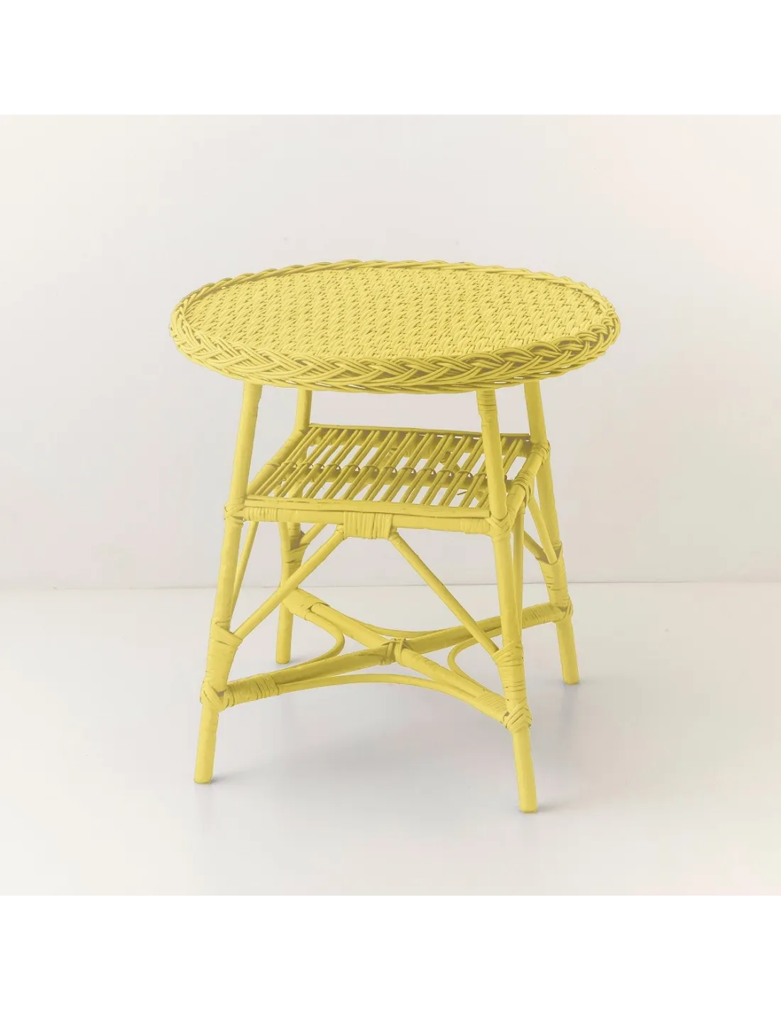Dimensions hors tout: haut 64 x diamètre 63 cm, diamètre du plateau seul 60 cm. Poids 5.5 kg. Structure, tressages, et arcades: osier naturel. Plateau en particules (aggloméré) sous le tissage. Finition: laque PU mate disponible en plusieurs coloris. Fabrication européenne (Pologne), finition française.