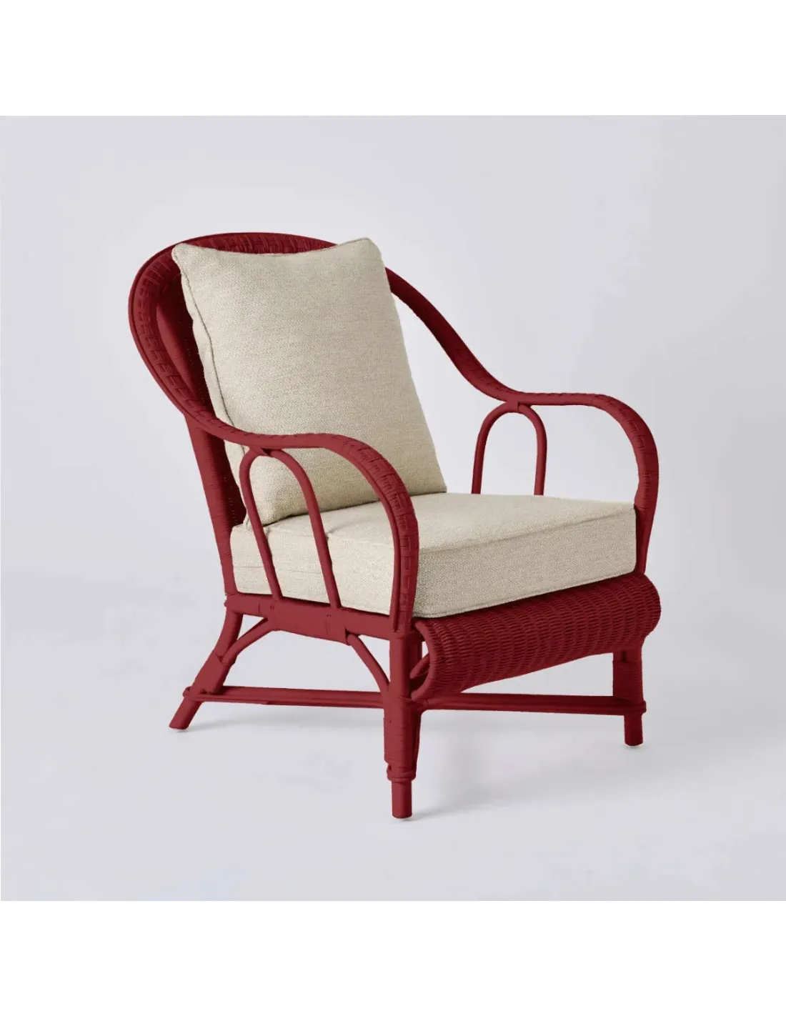 Structure en rotin naturel finition "laqué couleur". Mousse polyuréthane de densité 30 kg/m3 pour le coussin d'assise, et ouate de polyéther dans le coussin de dossier. Coussins déhoussables.