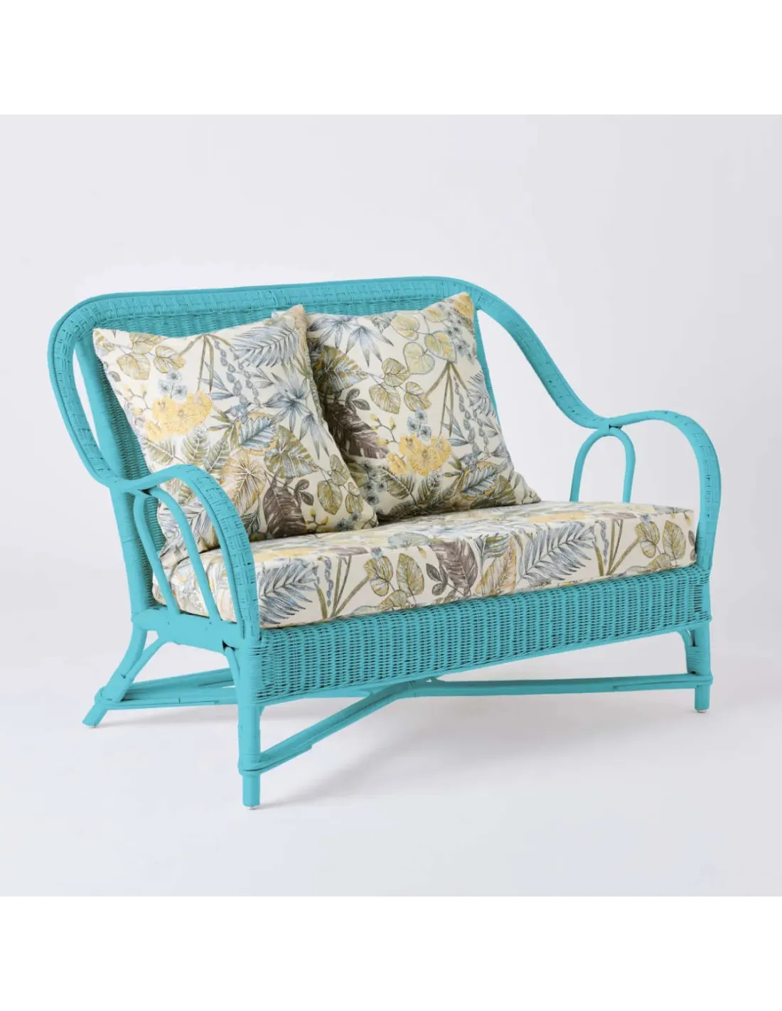 Canapé 2 places collection PRIMAVERA en rotin laqué bleu azur avec tissu bouquet écru