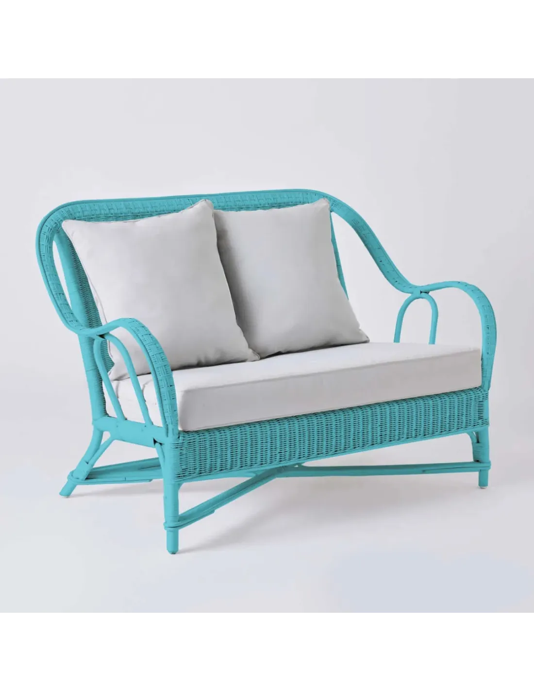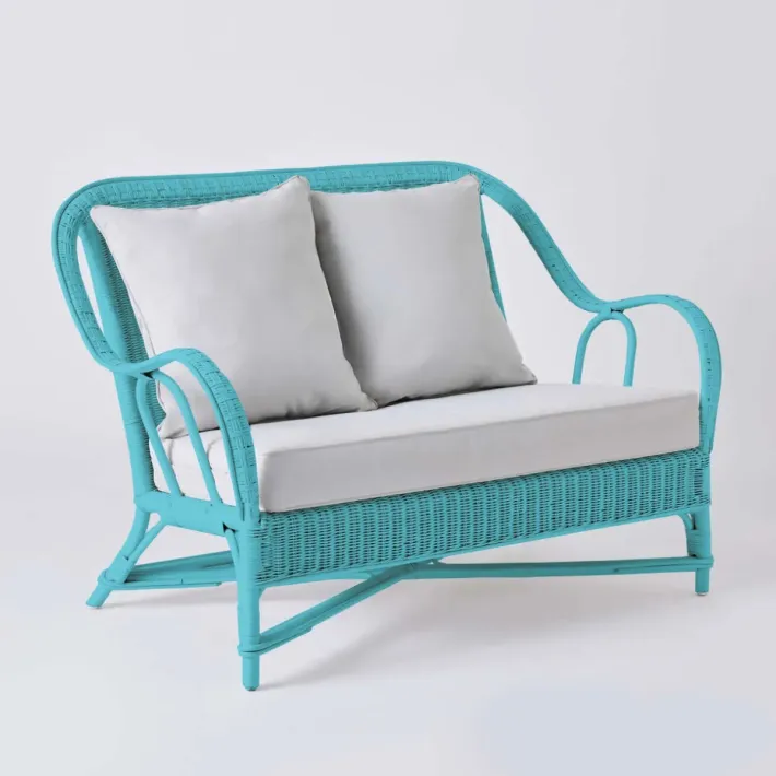 Canapé 2 places collection PRIMAVERA en rotin laqué bleu azur avec tissu gris perle