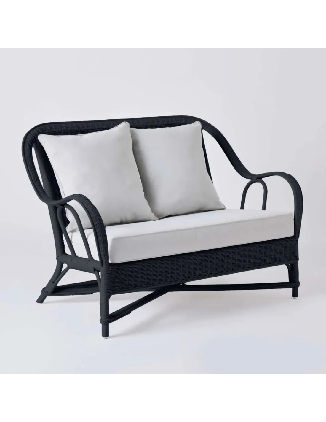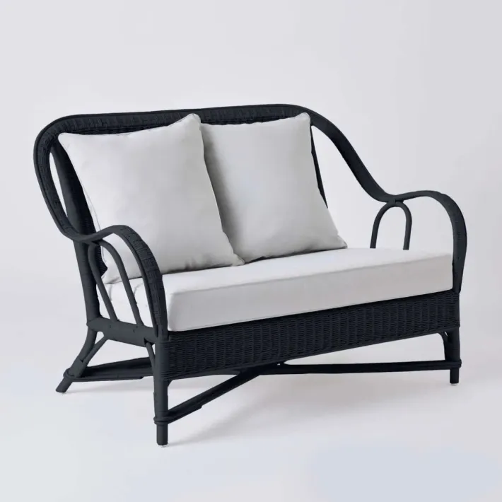 Canapé 2 places collection PRIMAVERA en rotin laqué noir avec tissu gris perle