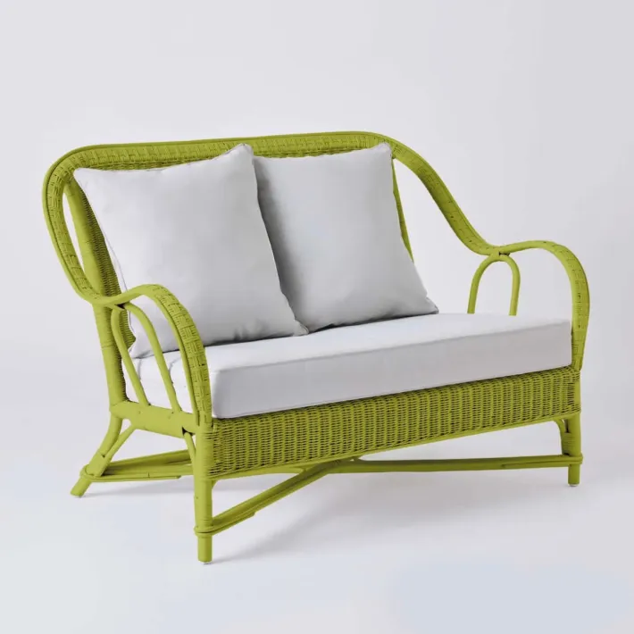 Le canapé en rotin tressé laqué couleur Primavera est inspiré des fameux fauteuils grand-père en rotin, mais présenté ici dans une version grand confort. À hauteur d'assise normale de salon, il est équipé d'un vrai coussinage déhoussable. Léger et naturel, ce canapé se déplace très facilement et saura vous rendre la vie facile. Peu ou pas d'entretien, utilisable au salon, en véranda.