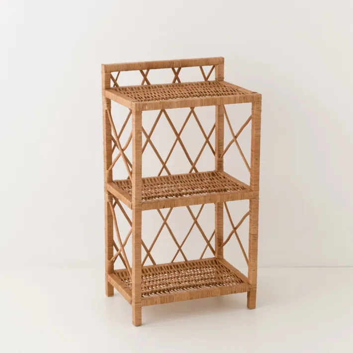 Dimensions hors tout : haut 73 x larg 39.5 x long 28 cm. Volume utile intérieur de chaque niche: largeur 34 cm x profondeur 28 cm x hauteur 27 cm. Poids 2.1 kg. Structure en pin, entièrement habillée de tressage et d'éclisse en osier naturel "buff" (ton cuivré) sans vernis ni teinte. Fabriqué en Europe, de façon totalement artisanale.
