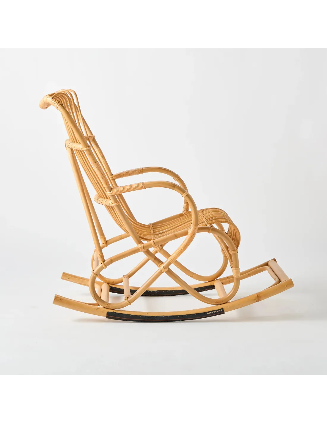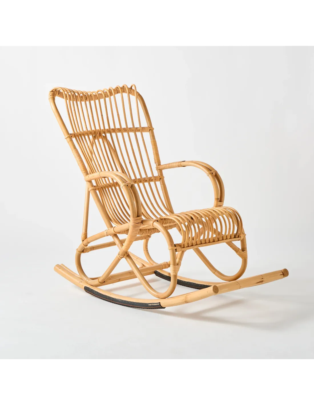 Toute une époque ! Le rotin vintage des années 60 revient en force. Léger, confortable et naturel, ce modèle historique réédité par la Maison KOK est équipé ici de patins pour permettre un doux balancement. Ce fauteuil rocking en rotin haut dossier (on peut reposer la tête) s'utilise plutôt sans coussin, grâce aux nombreux "filets" disposés verticalement, qui suffisent à son confort, mais nous proposons néanmoins en option et dans plusieurs coloris un coussin adapté à ce modèle. Tissu client disponible pour cet article. Nous contacter pour les modalités.