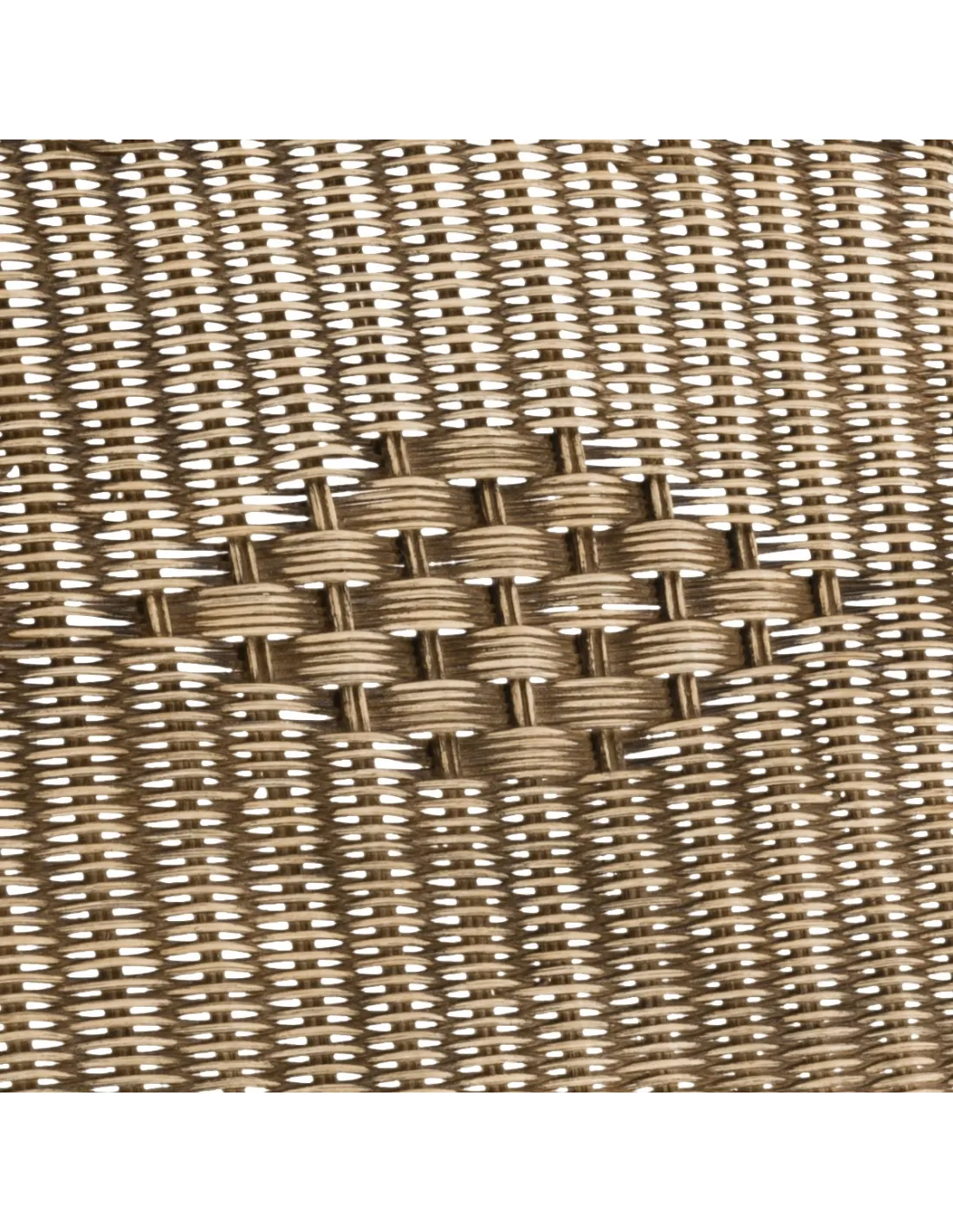 Structure en rotin patiné, tressage en moelle de rotin. Existe également en finition naturelle. Mousse polyuréthane de densité 30 kg/m3 pour le coussin d'assise, et ouate de polyéther dans le coussin de dossier. Coussins déhoussables.
