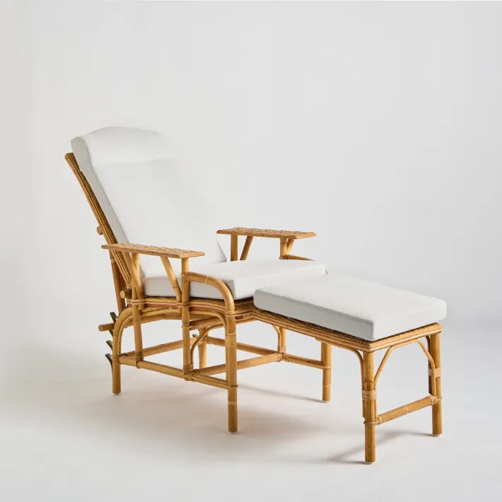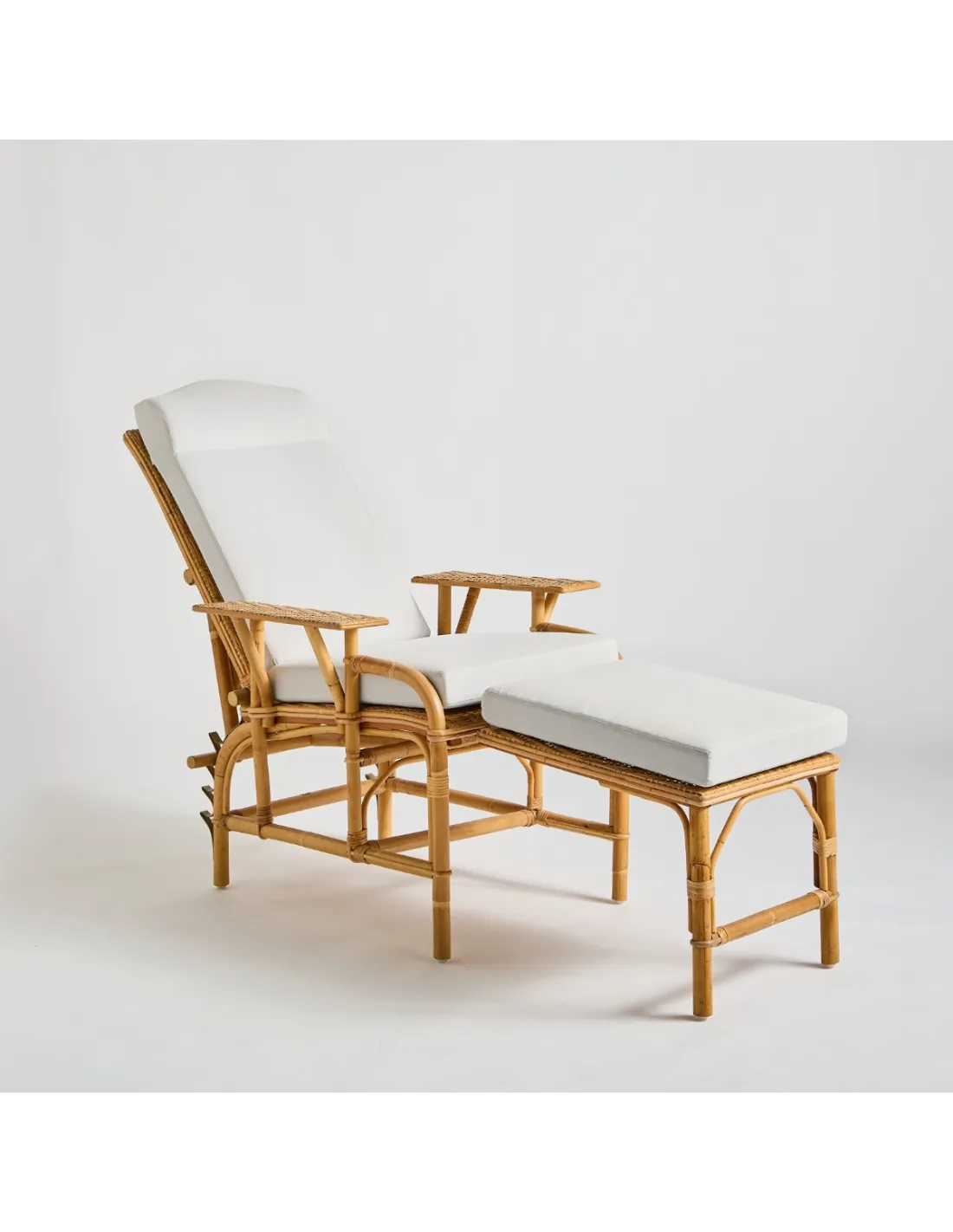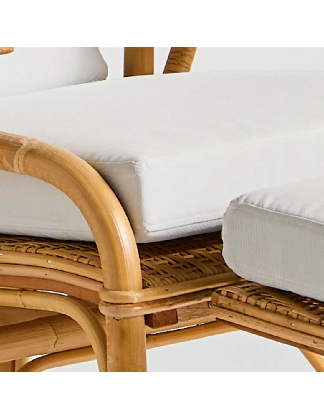 Ce coussin complet s'adapte sur la chaise longue en rotin "Grand-Mère" de chez KOK Maison. Vraiment très confortable, il est composé d'une assise et d'un dossier reliés par une pièce de tissu qui suivra l'inclinaison de la chaise longue. Un coussin pour le repose-pied et un coussin "oreiller" que vous pourrez utiliser en cale-reins ou en coussin de complément sont également disponibles. À noter, la découpe rembourrée de la têtière, pour un bon maintien des cervicales. Posé à même le sol, le coussin peut aussi servir de matelas d'appoint, pour une sieste ou une séance de lecture au grand air.