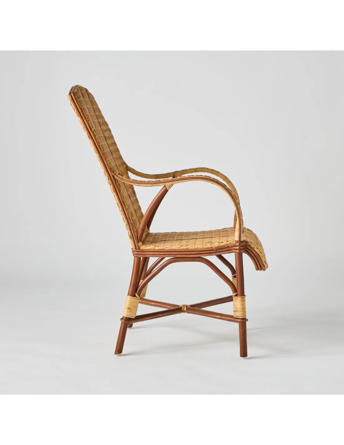 Le fauteuil en rotin Bagatelle, ici dans sa version haut dossier, est emblématique du rotin à la Française de la Belle Époque. À installer au salon, en véranda, au jardin d'hiver ou en terrasse couverte aux beaux jours.