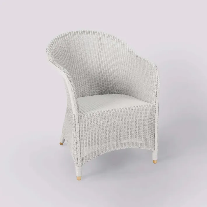 Dimensions : ht 88 x larg 58 X prof 59 cm, hauteur d'assise 42 cm du sol. Largeur d'assise 48 cm, profondeur d'assise 45 cm. Hauteur accoudoirs 63 cm. Structure en rotin, assise renforcée par des sangles. Le tissage "Lloyd Loom" est en fil métallique enrobé de papier kraft recyclé pour la douceur.